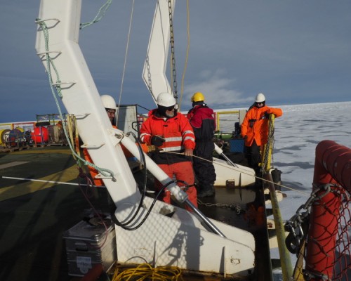 This expedition, which departed from Kirkenes in the boreal summer of 2015, marked the second field season of the NABOS-II project and was conducted to recover, service, and re-deploy all the instruments we deployed in 2013. This is always a challenge in these latitudes but fortunately, many of the moorings were in open water, or under relatively thin ice so the recovery rate was good with all but one of the moorings located and recovered. This one mooring from the Northwest of the array had been moved from it’s deployed position – potentially by a deep keeled iceberg which sometimes passes through this area and could not be located. Unfortunately, the search had to be abandoned due to time constraints though there may be opportunities to search more comprehensively on subsequent visits.
