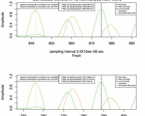 Fresh and Saltwater waveforms with various peak detection methods but giving similar results.